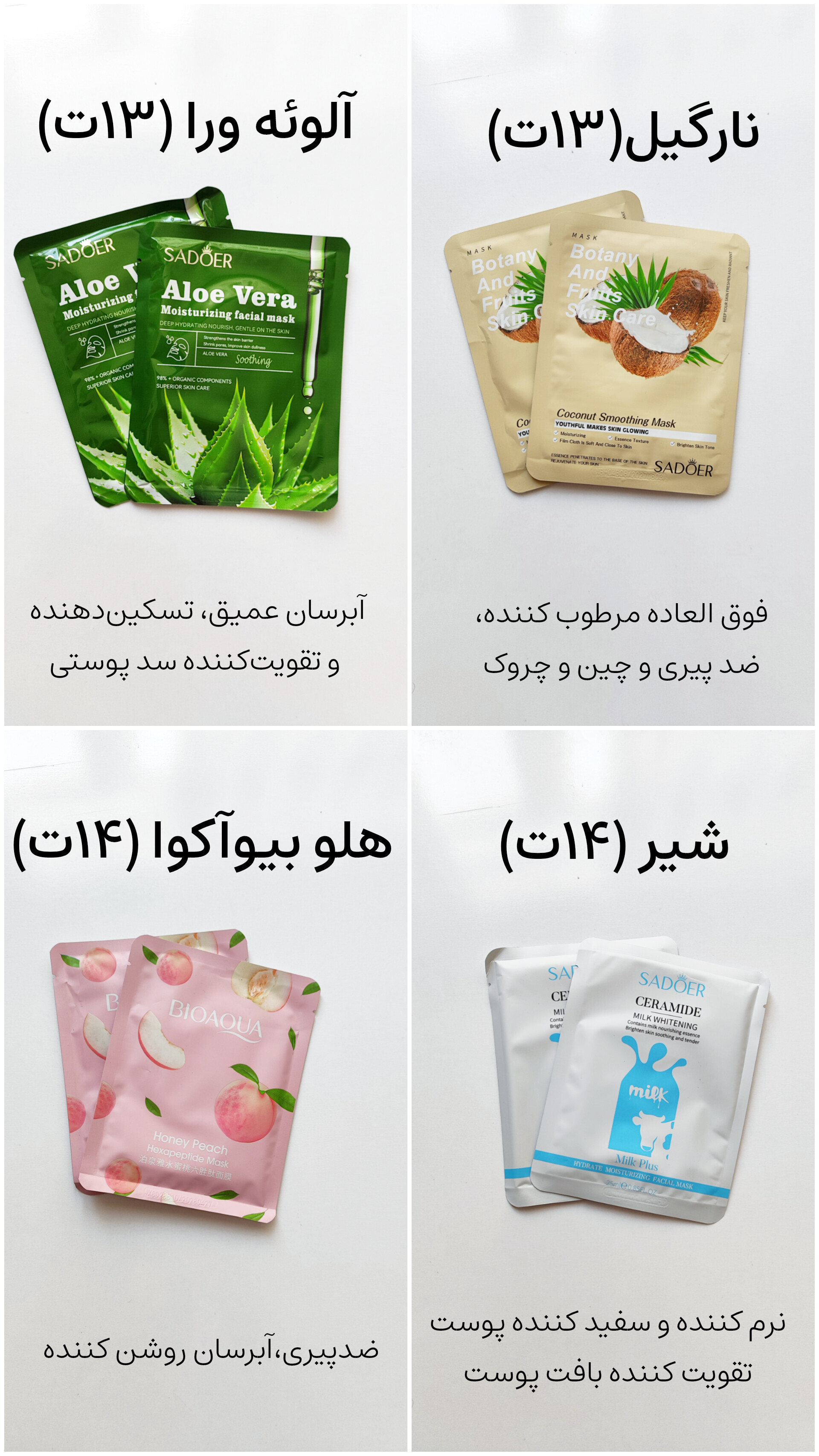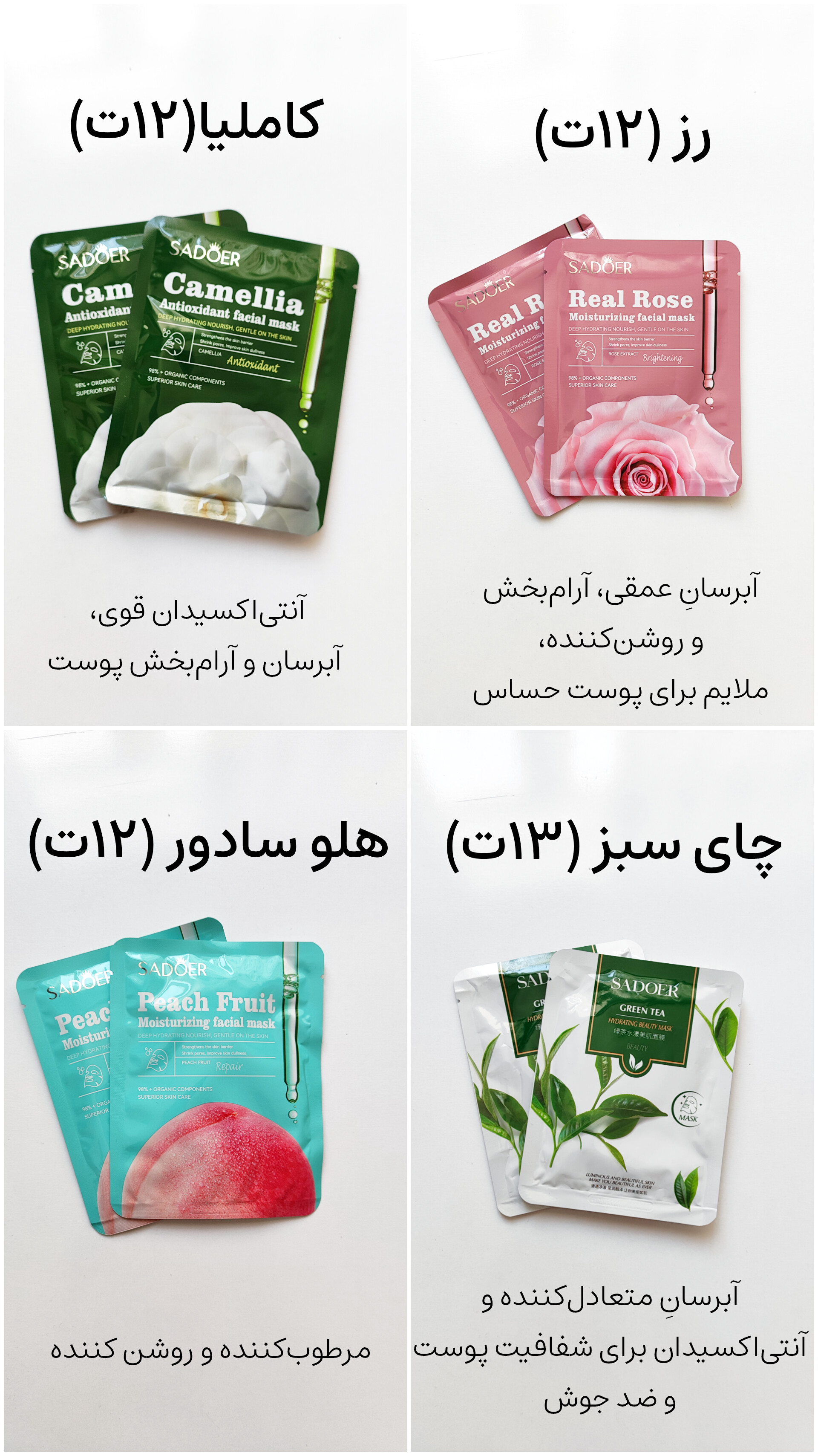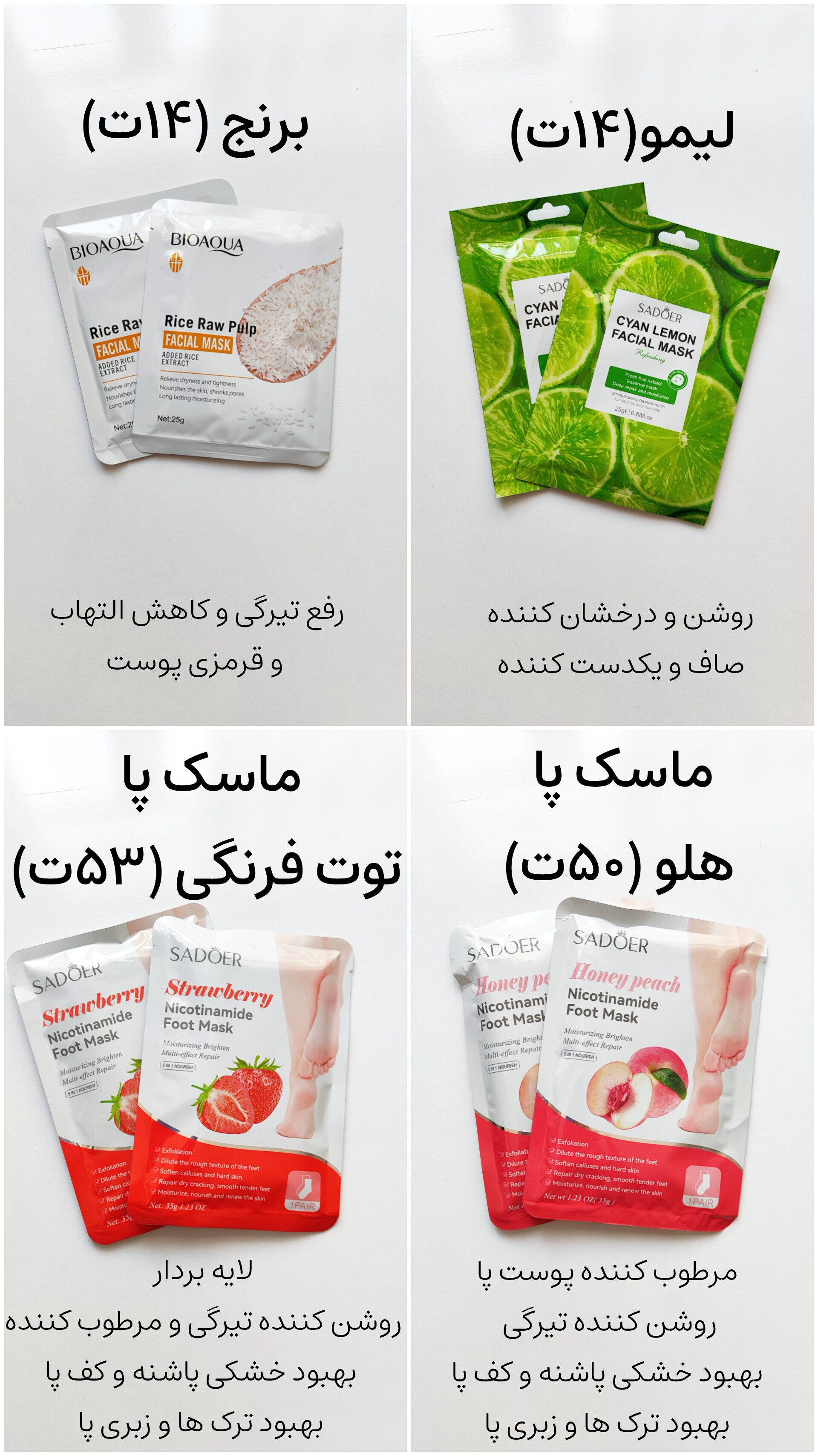/ رز / کاملیا / هلو سادور / چای سبز / نارگیل / آلوئه ورا / شیر / هلو بیوآکوا / لیمو / برنج / ماسک پا هلو / ماسک پا توت فرنگی / کلاژن / پپتید / فولرن کلاژن / پرو ویتامین / مخمر / نیکوتینامید / هیالورونیک اسید